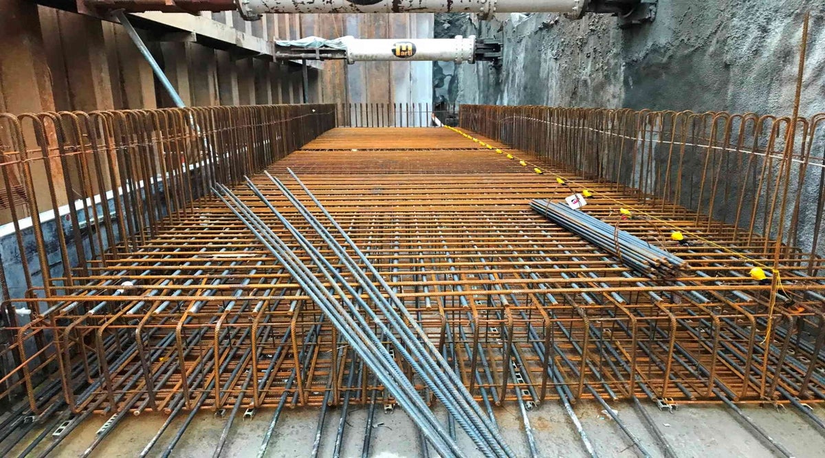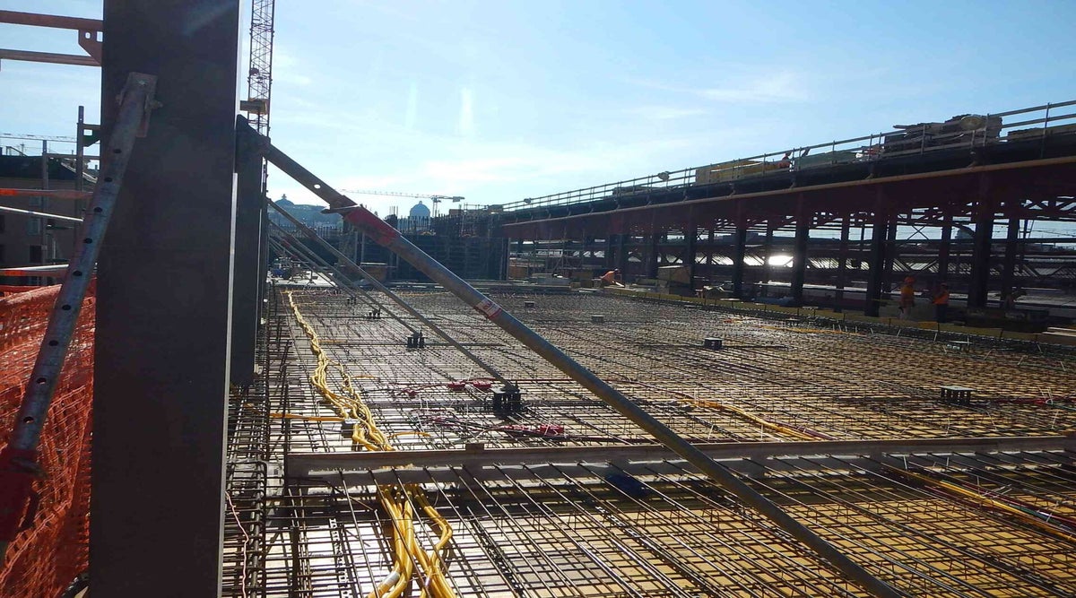 Bau von zwei gewerblichen Gebäuden auf einem gemeinsamen Untergeschoss und teilweise aufliegend auf dem bestehenden Eisenbahntunnel des Zürich Hauptbahnhofs.